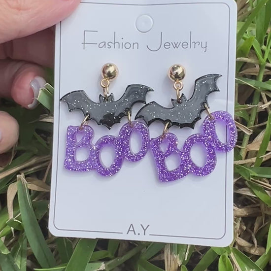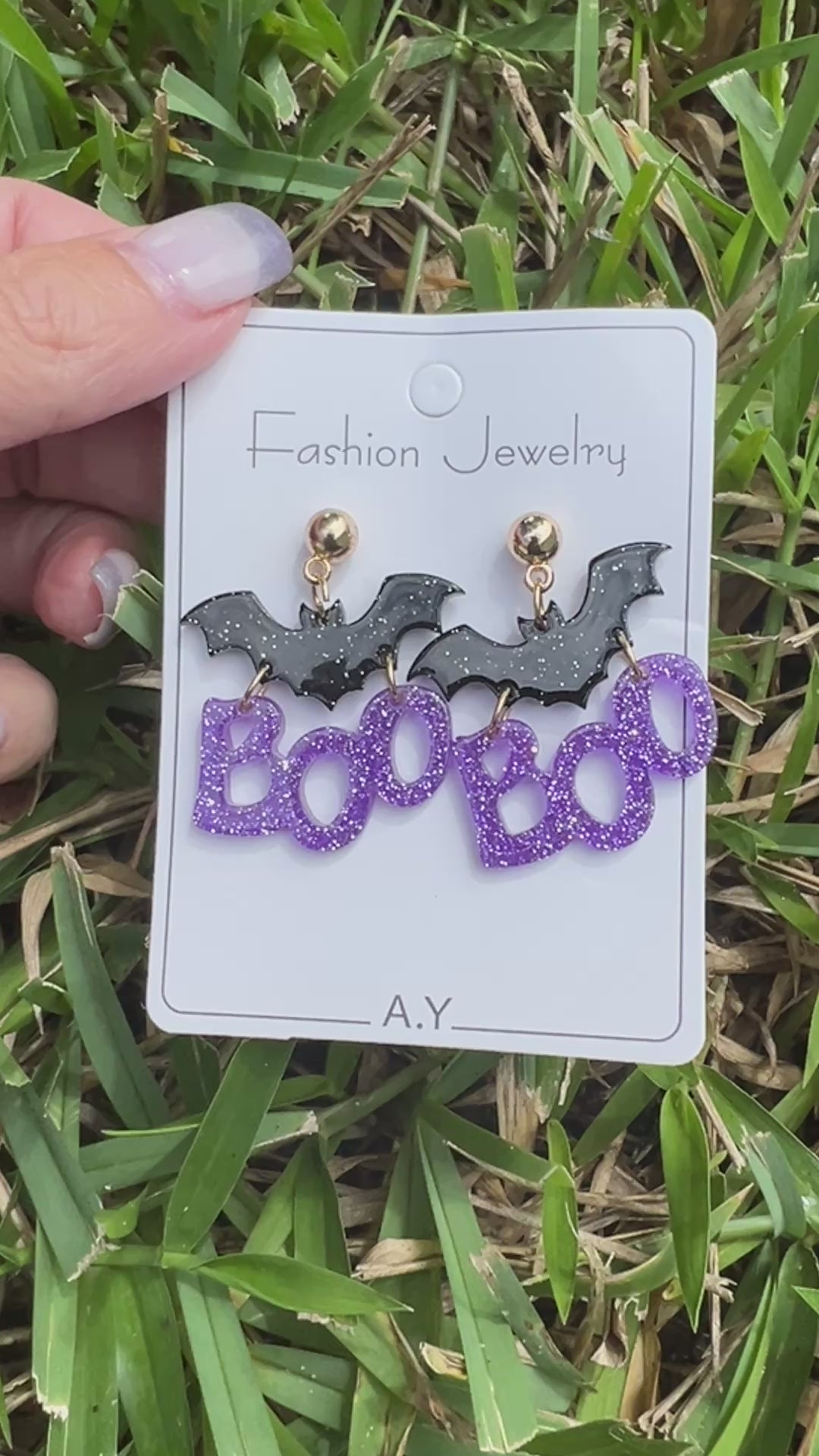 Fashion Dangle Purple Boo Earrings, Bat and Boo Design