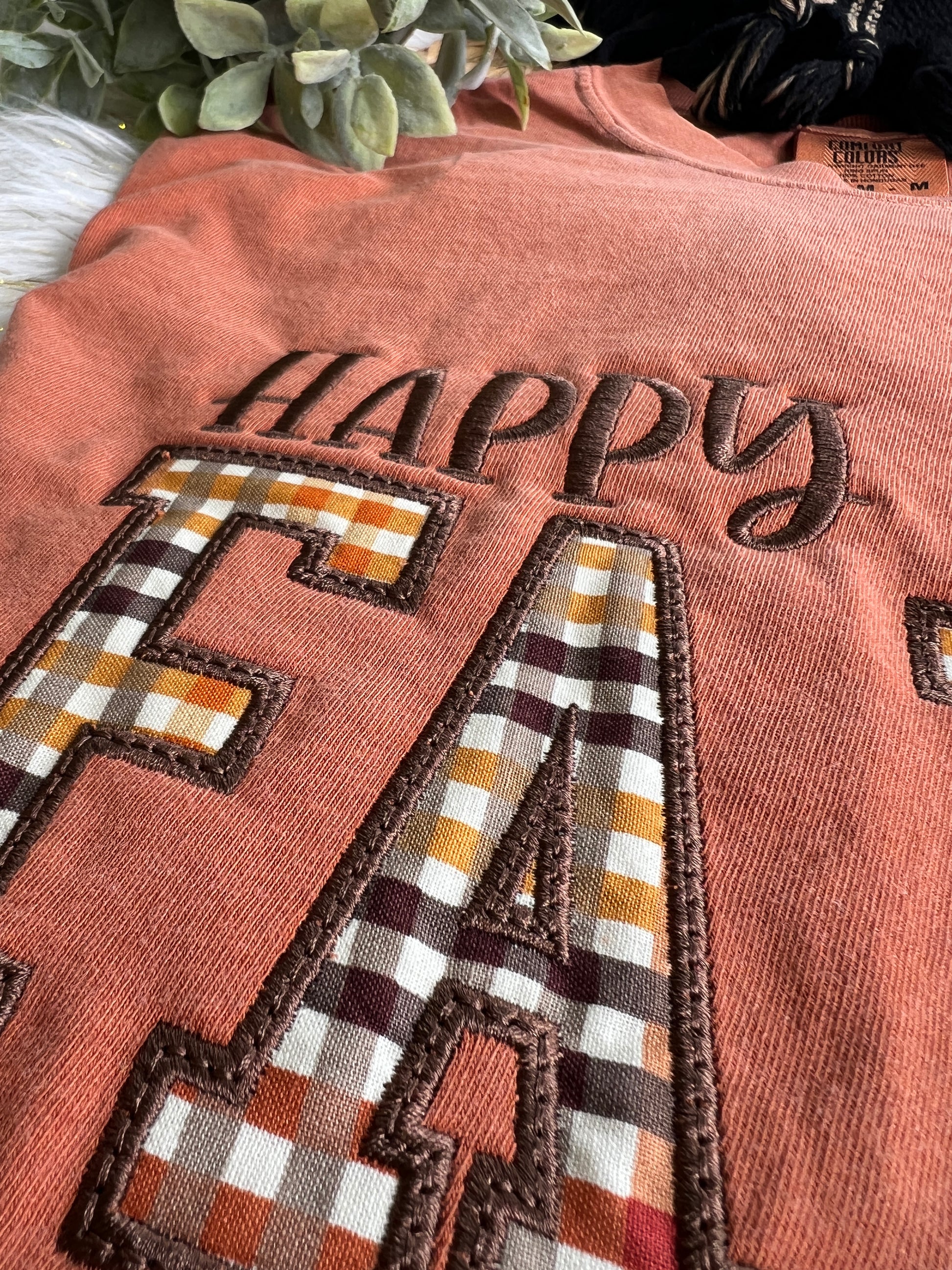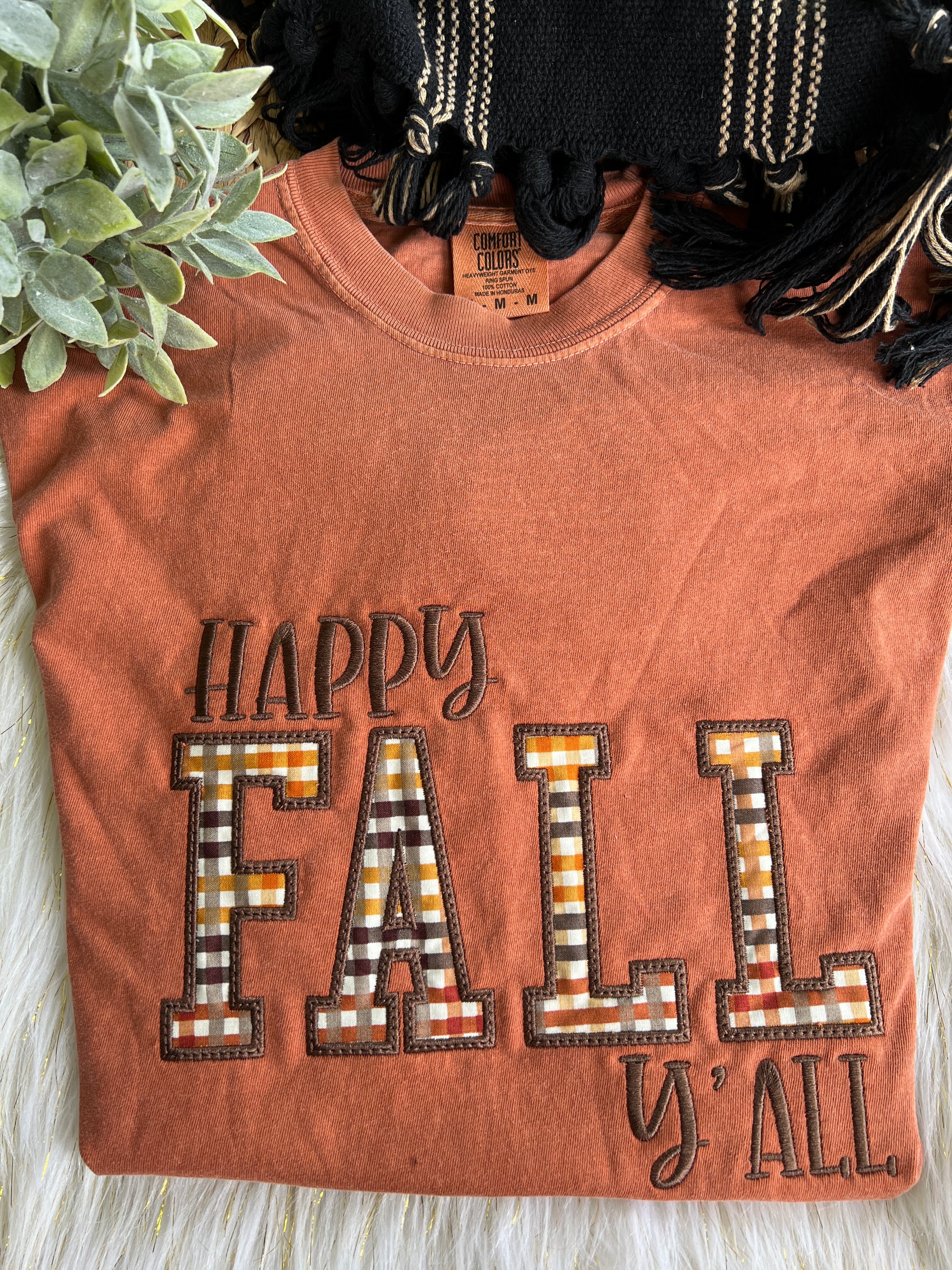 Happy Fall Y'all Fall Stripes Fabric Design Embroidery T-Shirt
