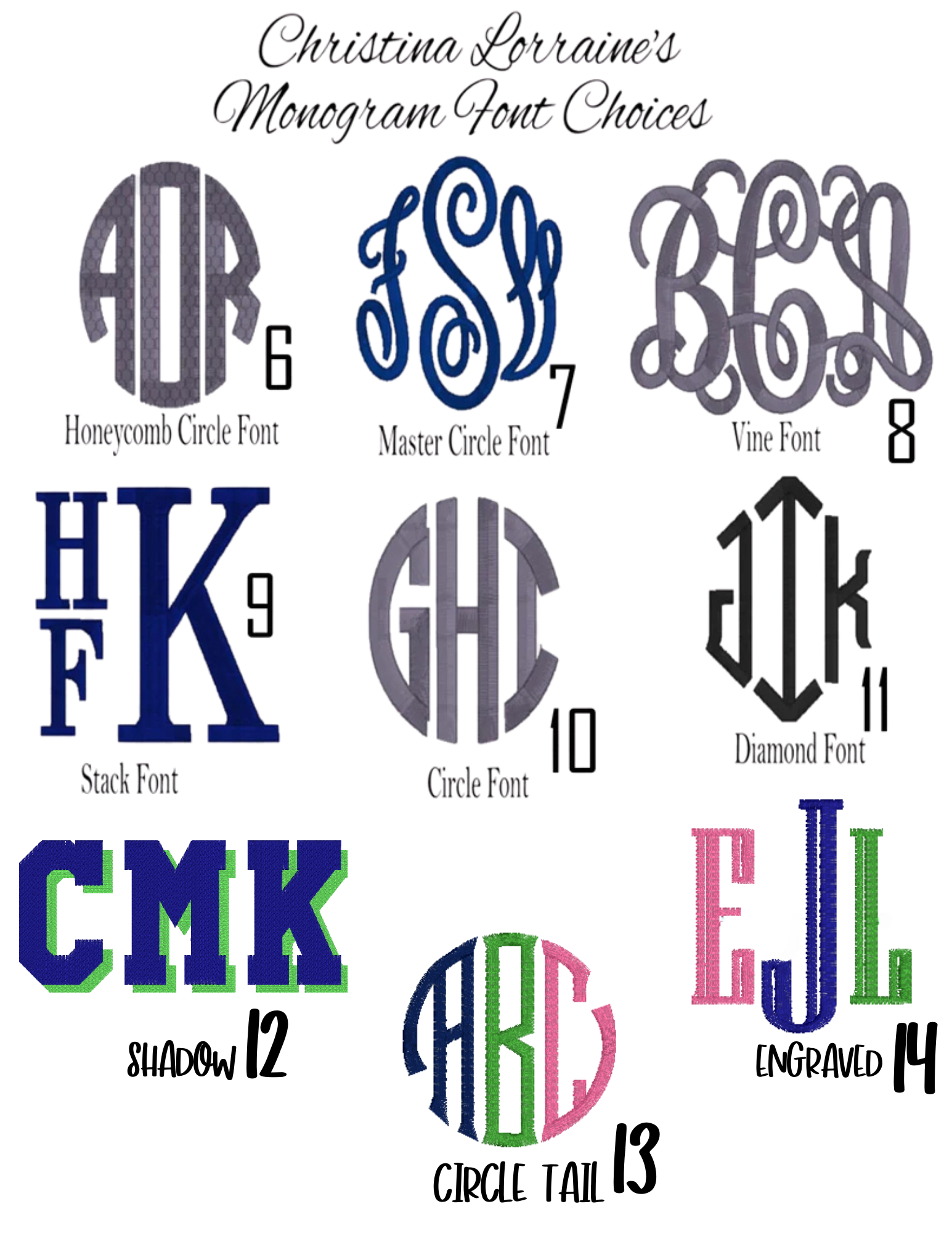 *PLEASE LEAVE YOUR MONOGRAMS IN THE ORDER OF FIRST, LAST, MIDDLE INITIAL.EX: CHRISTY LEE JETT= CJL.